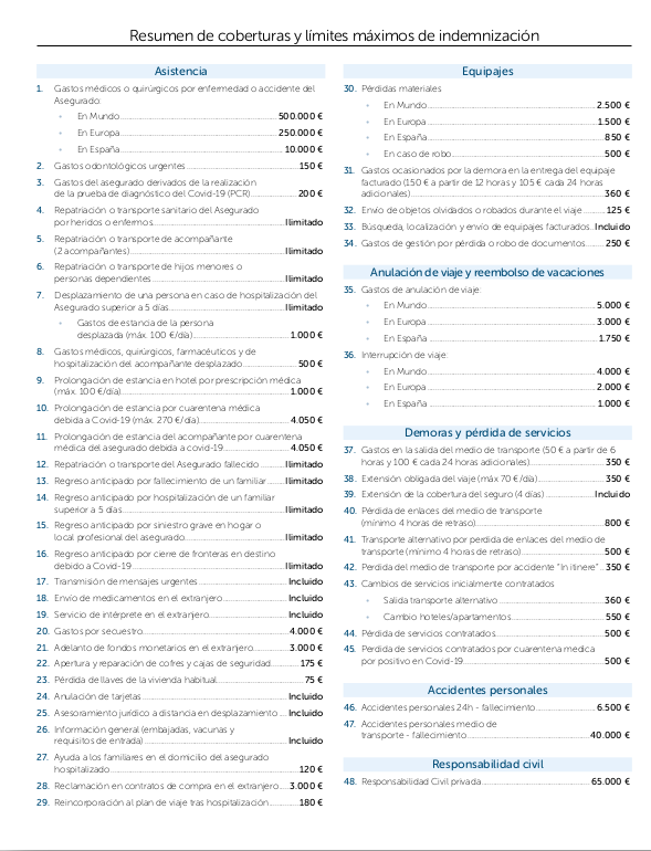 Para ver la descripción detallada de coberturas y límites máximos de indemnización para residentes en España, pulsa en la foto para ampliar. Para conocer las coberturas para NO residentes en España, contáctanos.